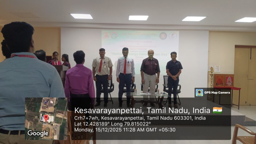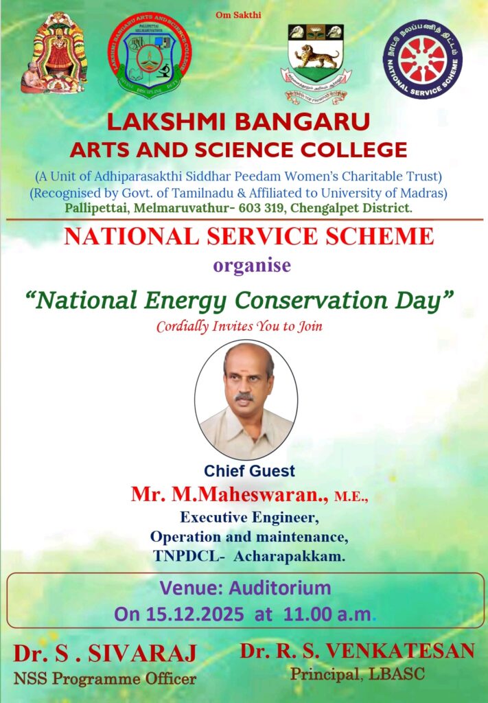 National Service Scheme (NSS) unit, in association with the Institution’s Innovation Council (IIC) of Lakshmi Bangaru Arts and Science College, Pallipettai, organized National Energy Conservation Day in the college auditorium On 15th December 2025 at 11:00 a.m. The event began with a warm welcome and introduction to the theme, followed by the presidential address by Dr. R. S. Venkatesan, Principal, who emphasized the vital role of energy conservation in fostering sustainable living and encouraged students to be responsible citizens. This was followed by insightful speeches from the distinguished chief guests. Mr. M. Maheswaran, M.E., Executive Engineer (Operation and Maintenance), Acharapakkam, addressed the gathering and shared valuable perspectives on the importance of conserving energy and its contribution to sustainable development. This was followed by Mr. S. Rajarajan, Assistant Executive Engineer (Operation and Maintenance), Acharapakkam, who delivered an inspiring talk on the significance of energy conservation and the importance of safety measures in everyday life. Both guests engaged the students with practical examples and encouraged them to adopt energy-efficient habits. The session included interactive participation from the students, who asked questions and discussed ideas related to energy use and environmental protection. To further promote awareness, Dr. S. Sivaraj, NSS Programme Officer, and Dr. G. Rajasekar, IIC Coordinator, jointly organized a Drawing Competition on the themes “Switch off Today, Shine Tomorrow: இன்று அணை, நாளை ஒளிர்” and “Energy Conservation Begins with Me: ஆற்றல் சேமிப்பு என்னிடமிருந்து தொடங்குகிறது.” More than 200 students and 20 faculty members participated enthusiastically in the competition, and winners were recognized with certificates and prizes for their outstanding contributions. The programme concluded with a meaningful message highlighting the importance of financial discipline and social responsibility, in line with the NSS motto “Not Me, But You.” The NSS Unit gratefully acknowledges and thanks the NSS Cell of the University of Madras for their constant encouragement and support in organizing this impactful programme. The event ended successfully with a vote of thanks, leaving students inspired to take active steps toward energy conservation and safety in their communities.