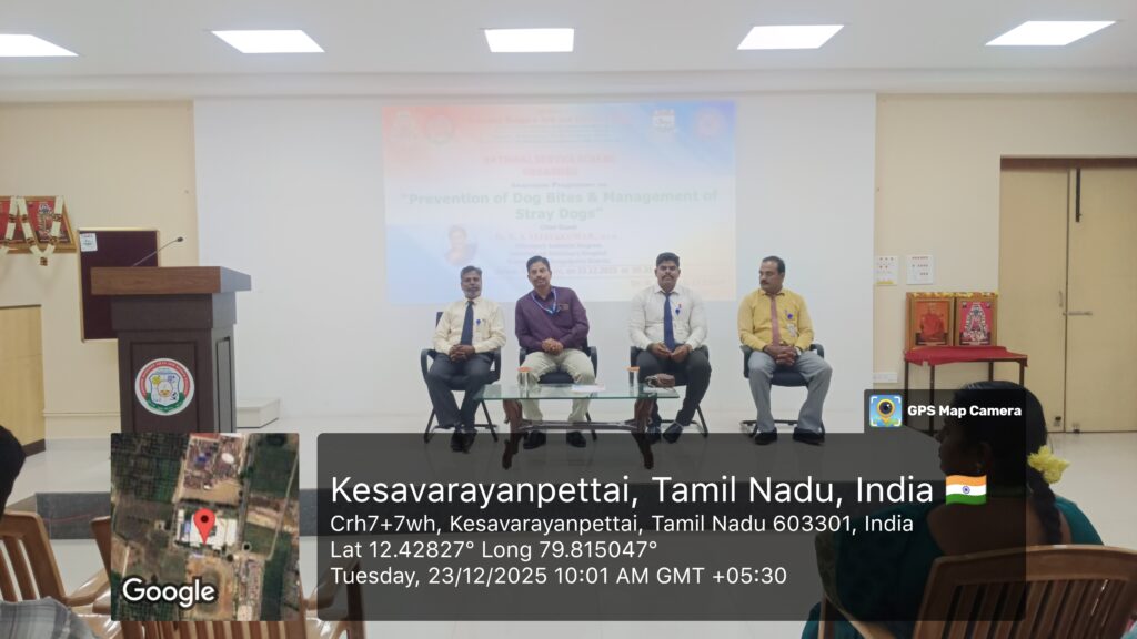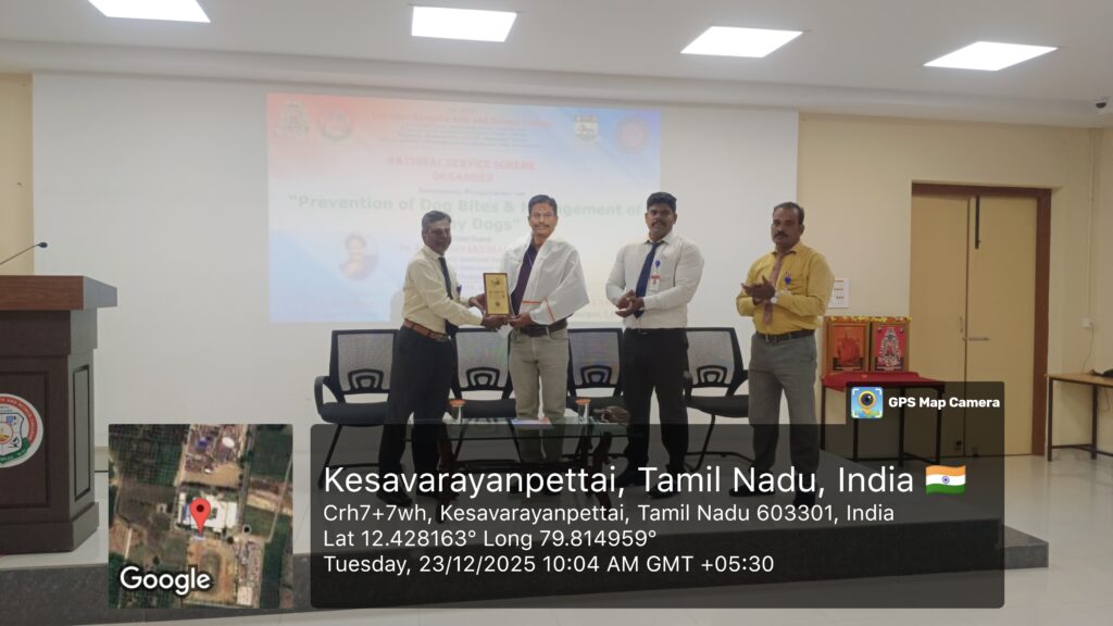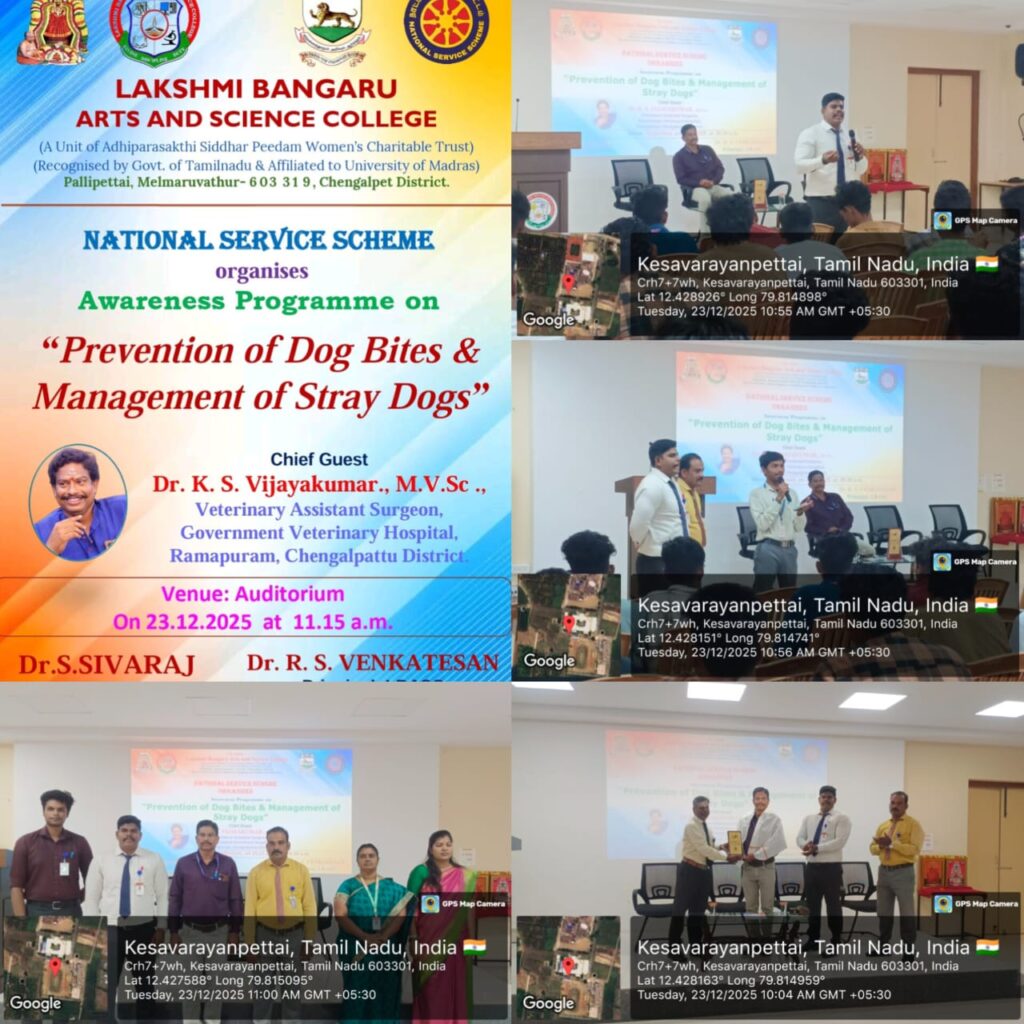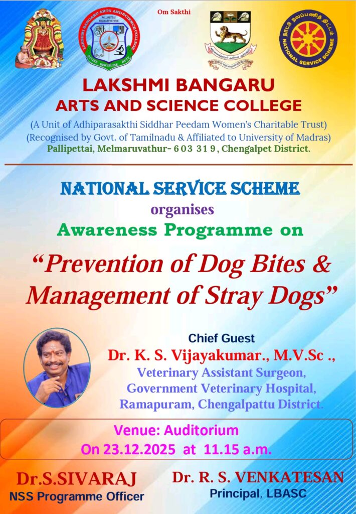 National Service Scheme (NSS) of Lakshmi Bangaru Arts and Science College, Pallipettai, Melmaruvathur, organised an Awareness Programme on “Prevention of Dog Bites & Management of Stray Dogs” on 23rd December 2025 at 11.15 a.m. in the College Auditorium. The programme was presided over by the Principal, Dr. R. S. Venkatesan, who emphasized the importance of public awareness on dog bite prevention and humane management of stray dogs. The Chief Guest, Dr. K. S. Vijayakumar, M.V.Sc., Veterinary Assistant Surgeon, Government Veterinary Hospital, Ramapuram, Chengalpattu District, delivered an informative address covering the causes of dog bites, preventive measures, first aid procedures, the significance of anti-rabies vaccination, and scientific methods for managing stray dogs.More than 200 students and 15 staff members actively participated in the programme, which successfully enhanced awareness on public health safety, animal welfare, and social responsibility among the participants. The programme was organised and effectively coordinated by the NSS Programme Officer, Dr. S. Sivaraj, whose planning and guidance ensured the smooth conduct of the event. The NSS Unit gratefully acknowledges and thanks the NSS Cell of the University of Madras for its constant encouragement and support in organising this meaningful programme. The programme concluded with a message reinforcing the NSS motto “Not Me, But You”, highlighting the importance of continued social service and community involvement.