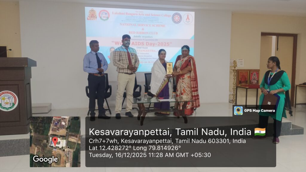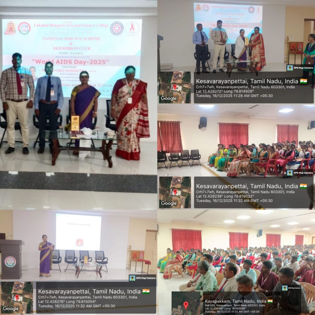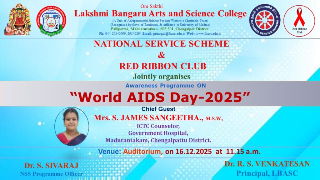 The National Service Scheme (NSS) and Red Ribbon Club (RRC) of Lakshmi Bangaru Arts and Science College, Melmaruvathur, jointly organised an Awareness Programme on “World AIDS Day – 2025” on 16th December 2025 at 11.15 a.m. in the College Auditorium.